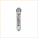 Картридж предлагается в 2” прозрачном линейном корпусе, изготовленном из материала PET (полиэтилентерефталат) с подсоединением 1/4” РВ, с двумя заглушками с уплотнительными кольцами. Заглушки предохраняют его от попадания во внутрь загрязнений (в том числе микроорганизмов). Корпус служит как «экран» (защита), не пропускает эмиссию частичек наружу картриджа.